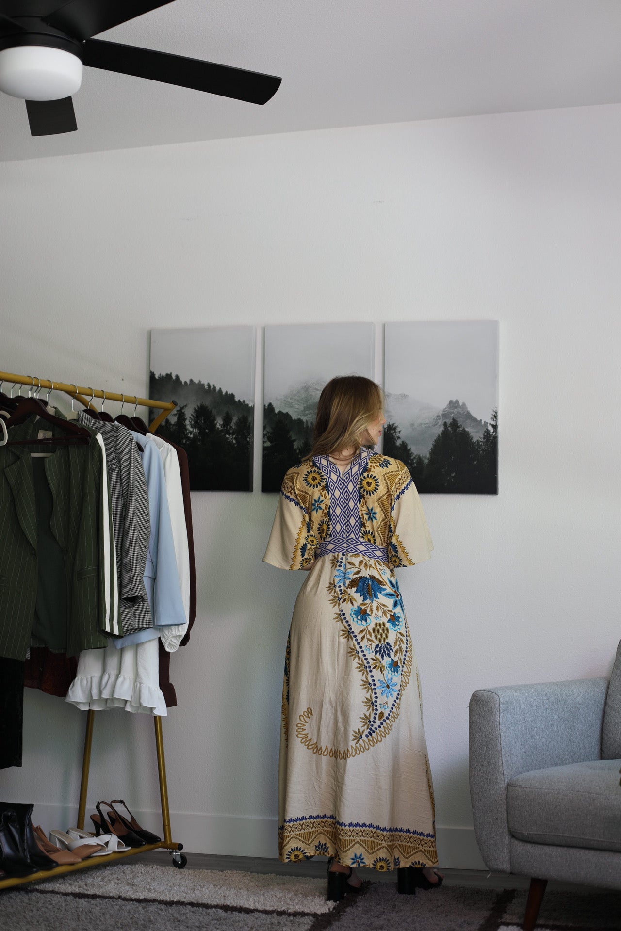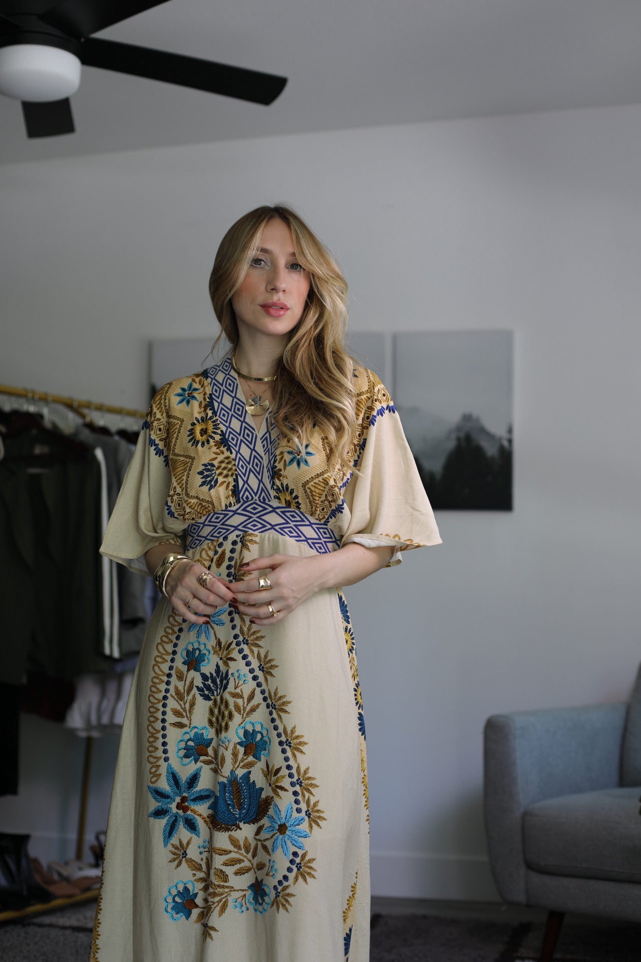 Its design features intricate embroidery in shades of blue, mustard, and beige, creating a vibrant yet refined harmony. The V-neckline elongates the silhouette, while wide sleeves add movement and lightness. The long length enhances its sophisticated appeal, making it perfect for special occasions or a polished summer look.