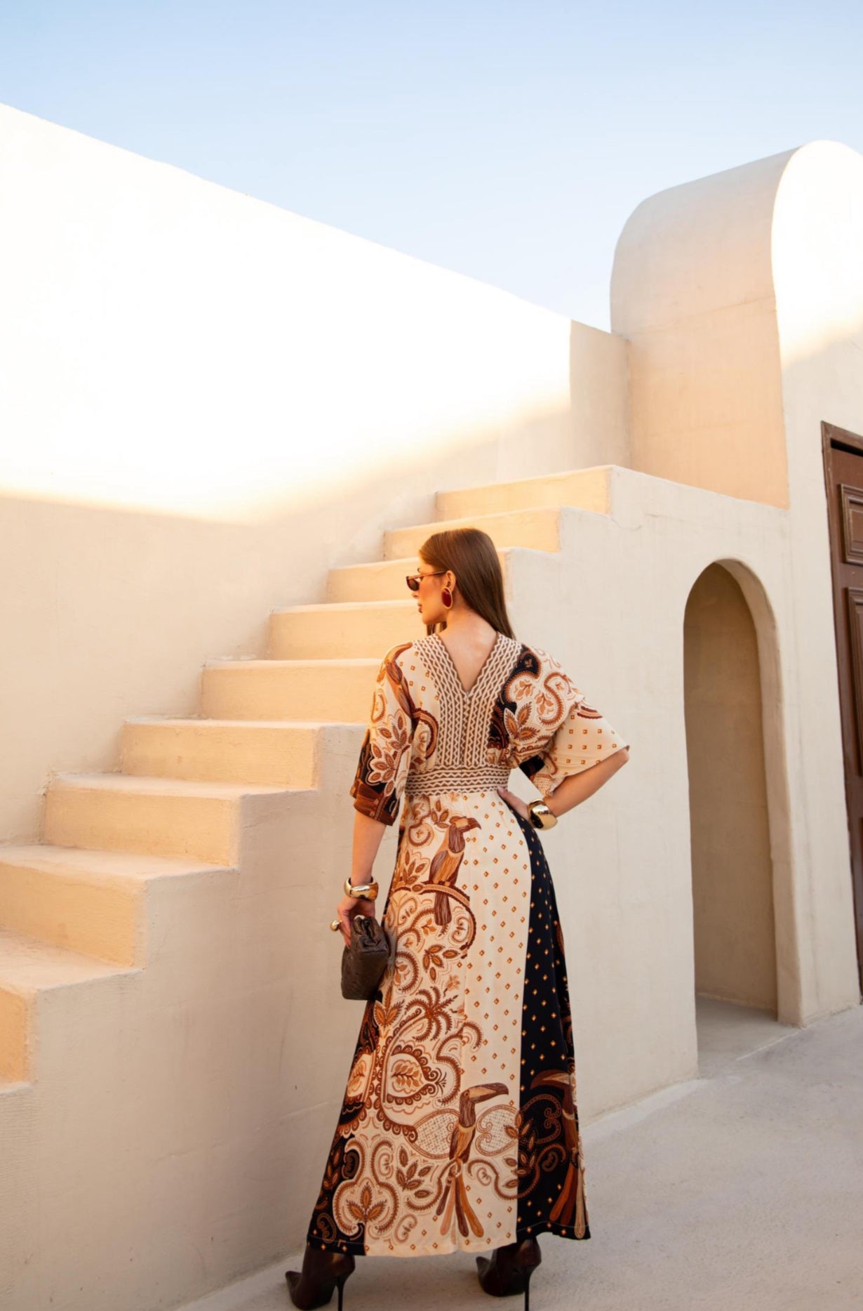 The Alice Dress is a striking piece that blends artistry with sophistication. Made from lightweight, fluid fabric, it ensures comfort and an elegant drape, perfect for those seeking style with personality. With its paisley print in earthy tones, this design delivers a unique aesthetic. The V-neckline elongates the silhouette, while the waist tie allows for versatile adjustment, naturally enhancing the figure. Flowing wide sleeves complete the look with movement and lightness. Ideal for special occasions or elevated casual outfits, the Alice Dress is a versatile choice full of character.