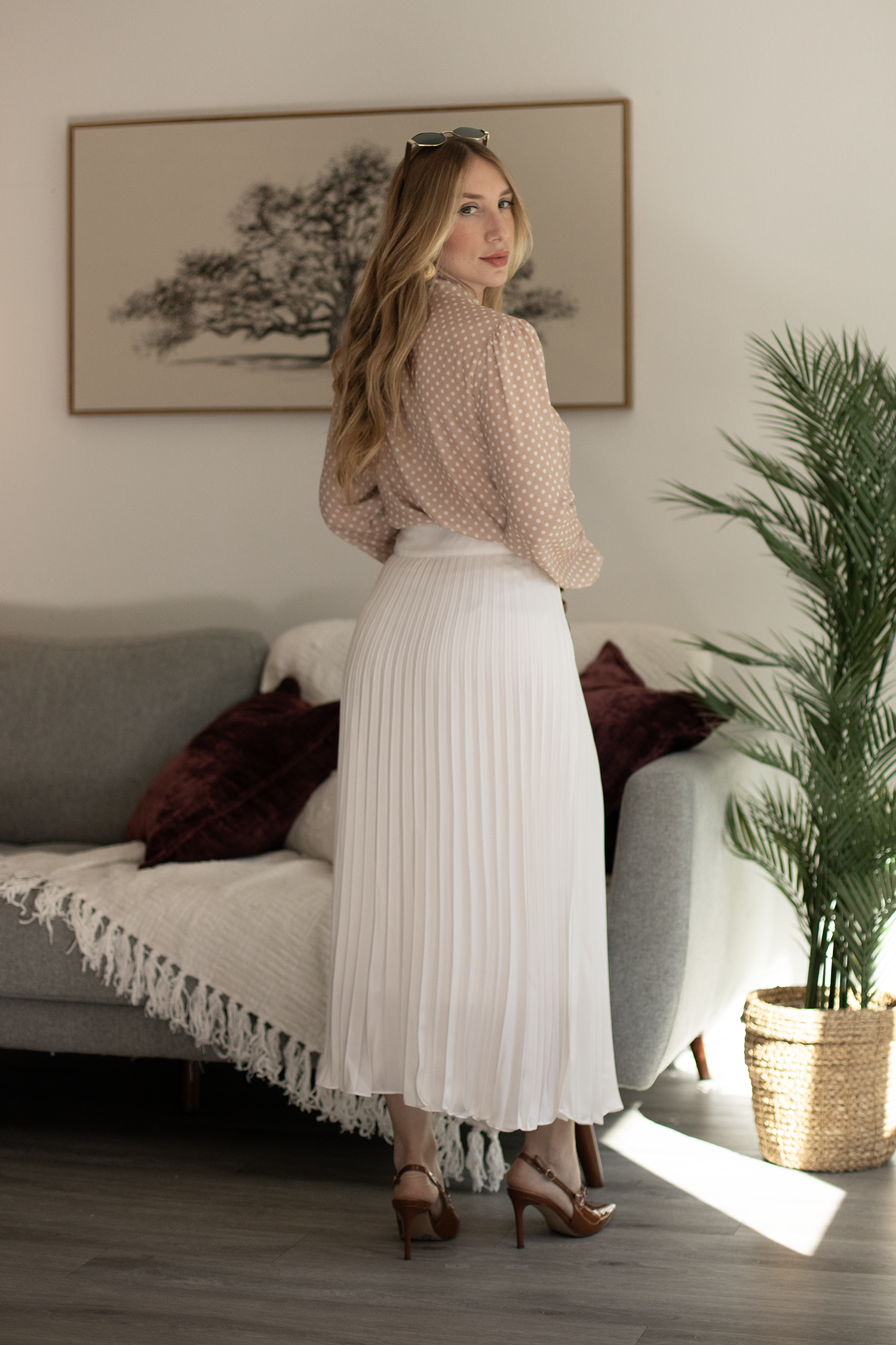 Feminine and timeless, this polka-dot blouse combines delicate charm with versatile sophistication. Designed with a high neckline and an elegant self-tie bow, it brings subtle movement and detail to any outfit. The lightweight fabric drapes gracefully, making it a perfect choice for both professional and social occasions. Made from 100 percent Brazilian polyester with a soft, airy finish.