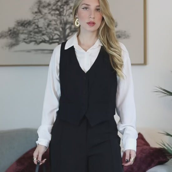 A modern classic that blends sophistication with versatility. This black vest features a tailored fit, deep V-neckline, and covered button closure, adding an elegant, timeless touch. The decorative pockets highlight its minimalist design, making it perfect for both sleek tailoring ensembles and stylish casual pairings.