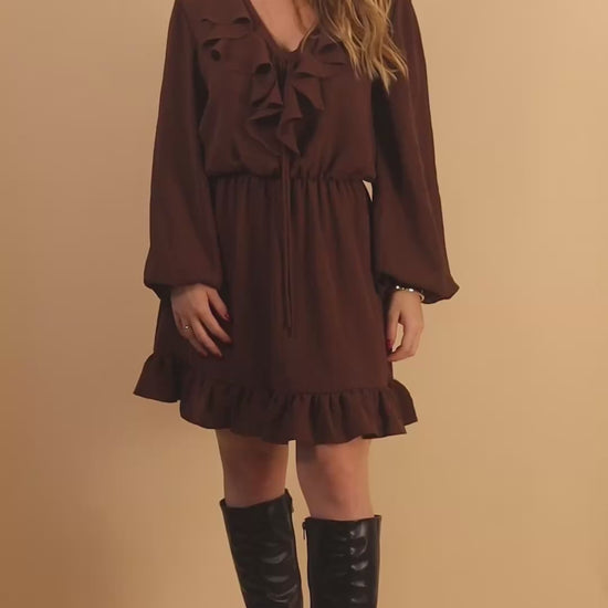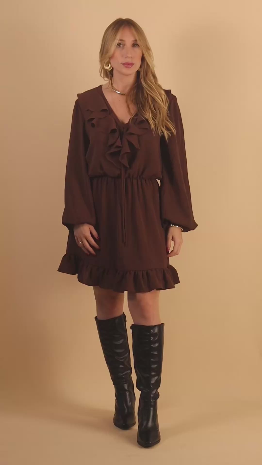 This brown mini dress combines charm and comfort with a playful touch of sophistication. Designed in 100% polyester, it features a soft drape that moves beautifully with every step. The ruffle details along the neckline and hem add feminine flair, while the tie at the waist defines the silhouette for a flattering fit. Long sleeves with gentle volume balance the look, making it versatile for both daytime outings and evening gatherings.