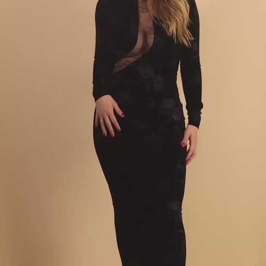 This black velvet midi dress is the perfect balance of elegance and sensuality. Made from 95% polyester and 5% elastane, it features a delicate sheer detail in 100% polyester lace and a full polyester lining for comfort. The long sleeves and figure-hugging silhouette create a sophisticated look, while the floral velvet texture and daring lace cut-out add a touch of bold femininity.