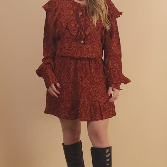 This printed mini dress brings a romantic touch with its warm brown tones and delicate paisley pattern. Crafted from a soft blend of 60% viscose and 40% polyester, with a 100% polyester lining, it offers both lightness and structure. The design features ruffle accents along the neckline and hem, a drawstring tie at the waist for a flattering silhouette, and long sleeves with subtle volume for an elegant finish.