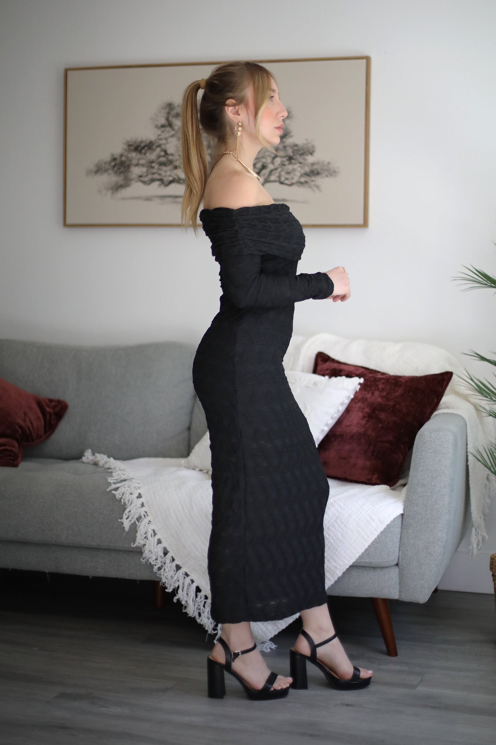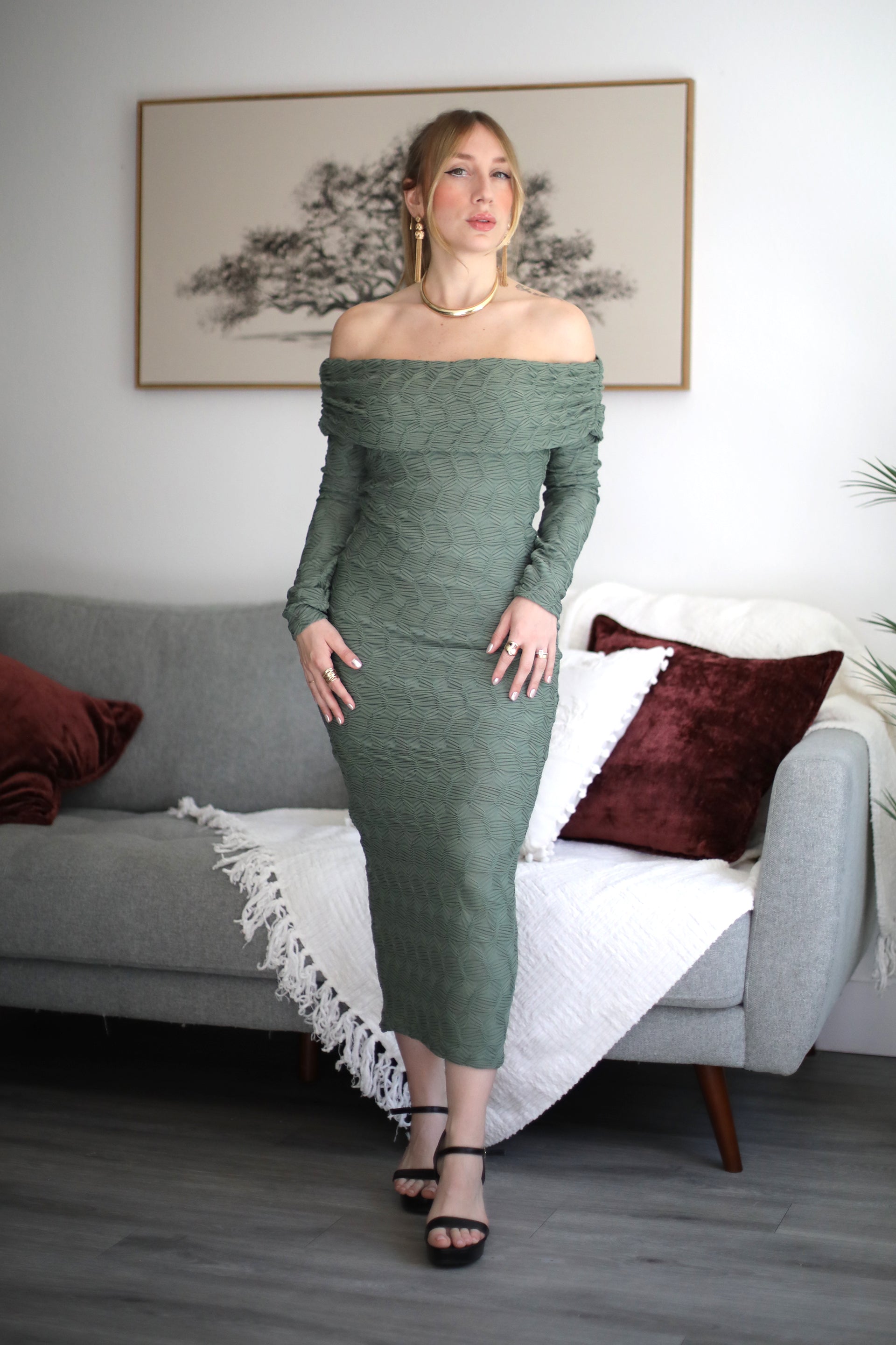 This off-shoulder textured midi dress is the perfect combination of elegance and comfort. Its textured fabric adds depth and sophistication, while the body-hugging silhouette enhances femininity with subtle stretch for ease of movement. Designed in 98% polyester and 2% elastane, with a 100% polyester lining, it ensures durability and a smooth fit.